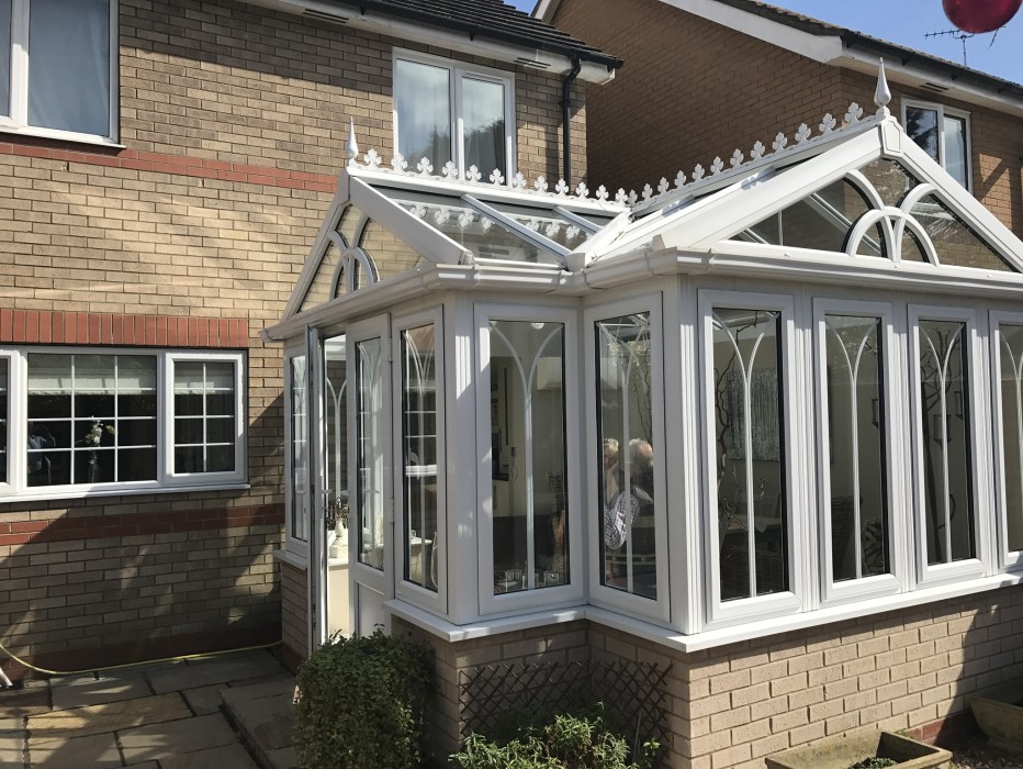 White upvc frames with glass roof to reflect the sun , near Peterborough